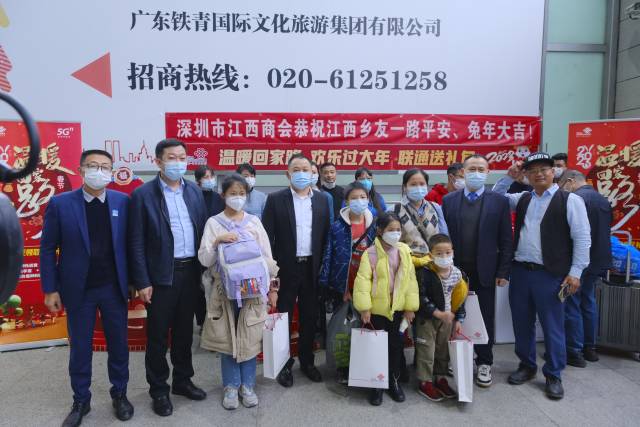 “一路平安,兔年大吉!”站台上,深圳市江西商会在深圳东站工作人员的“护送”下热闹地组织“老乡们”进行出发前的合影。