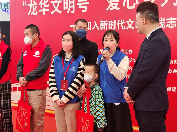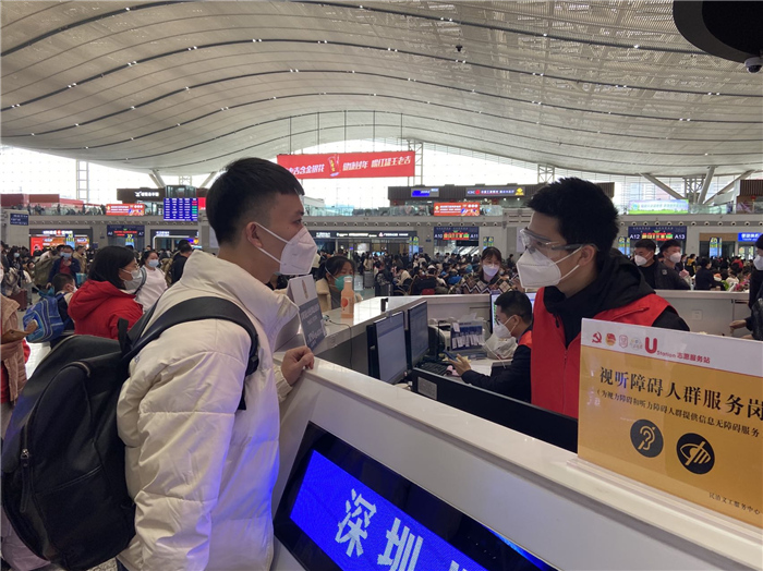 “春风春日贺新岁,兔年兔岁送吉祥,提前祝大家新年快乐!”由深圳北站和龙华区各部门联合举办的爱心专列新春关爱系列活动在候车室内温情上演,引来旅客们驻足观看、打卡拍照。同时,16名深圳北站迎春花服务队队员和50余名党团员青年志愿者在现场参与组织活动,为现场广大旅客提供答疑引导、扶老携幼等暖心服务。