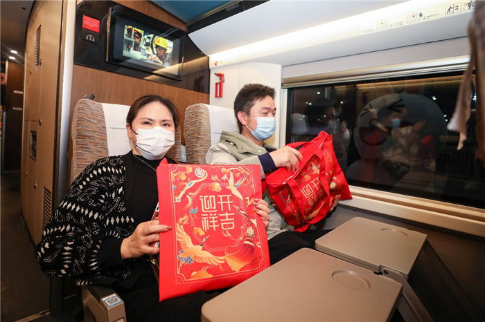 “爸妈,我快上车了,再有5个多小时就到家啦!”迎春花服务台前方,家在湖北武汉的张女士欣喜地与家人进行视频连线,“你们看,候车室里面在开展关爱活动,我收到了文明福袋、纪念车票还有书法家现场写的对联。”