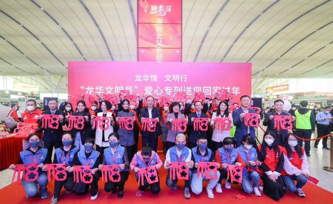 为深入贯彻落实党的二十大精神,礼遇关爱新时代文明实践志愿者,1月13日,由深圳市文明办指导,龙华区委宣传部(文明办)联合深圳北站、区总工会、团区委、区慈善会、民治街道开设“龙华文明号”爱心专列,为龙华区部分优秀文明实践志愿者和城市奋斗者提供免费返乡车票,暖心助力其回家团聚。龙华区委常委、宣传部部长黄立敏,区人大常委会副主任、群团工作部部长、区总工会主席李友华,广深铁路、区委宣传部(文明办)等相关单位负责人出席活动。