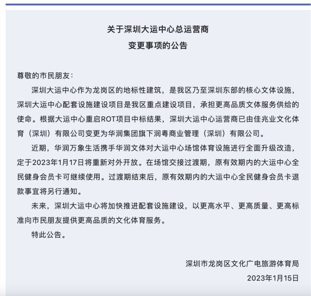 1月15日,深圳市龙岗区文化广电旅游体育局发布关于深圳大运中心总运营商变更事项的公告。