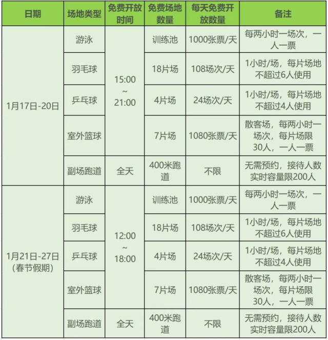 在试运营期间,1月17日至27日,龙岗区文化广电旅游体育局联合深圳大运中心开展公益行动,游泳、羽毛球、室外篮球、乒乓球、田径五大运动项目免费对市民开放,具体免费开放计划如下: