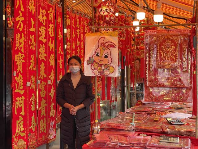 在花市的商铺档口,硕果满枝的年桔盆景从数十厘米到数米不等,蝴蝶兰、水仙花等盆栽娇艳多姿,百合、水仙、小雏菊等鲜花竞相绽放。商户在品种选择、花朵造型上做足工夫,把修剪打理好的花束、盆景摆放在显眼位置,叫卖声、询价声不绝于耳。