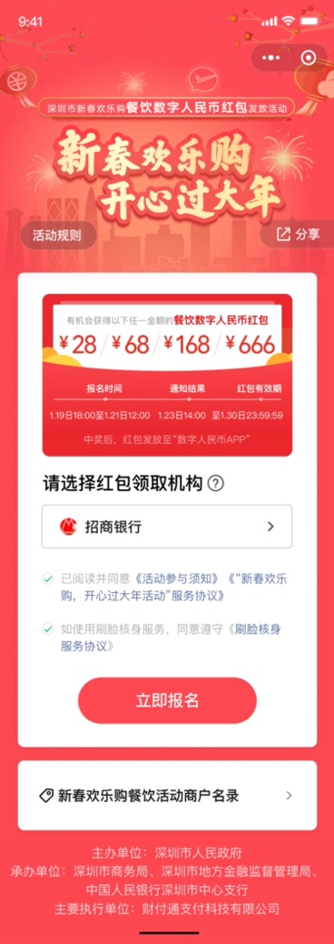 活动采取“预约报名、抽签摇号”方式进行,共分春节、元宵两期开展。将从报名用户中随机抽取中奖对象,随机发放28元、68元、168元和666元四种金额无门槛餐饮数字人民币红包。