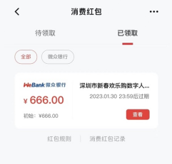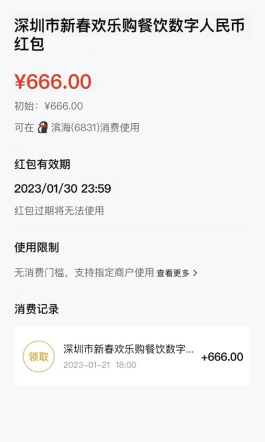 深圳市两轮餐饮新春红包均为无门槛数字人民币红包,第一轮数字人民币红包使用有效期至1月30日23:59:59,逾期将被收回。可在深圳地区开通数字人民币支付且已报名参加本次活动的餐饮门店核销,具体门店参见“深圳新春红包”微信小程序页面。消费者打开数字人民币App,选择红包所属机构,上划出现付款码或右上角扫一扫即可进行核销。