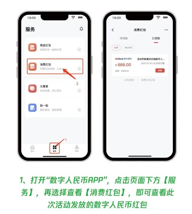 中奖用户请先通过应用市场下载“数字人民币(试点版)”APP,使用报名时登记的手机号码注册,开通报名时所选机构的数字人民币钱包(必须与报名时选择机构一致,否则无法领取红包),即可在“服务-消费红包栏”查看中签后的数字人民币红包。