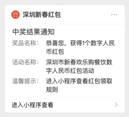 1月23日14点前,“深圳新春红包”微信小程序会以微信消息的形式通知中奖用户,数字人民币红包最迟将于1月23日18:00前发放至用户报名手机号绑定的数字人民币钱包中,具体红包到账时间以机构发放为准,活动期间每人仅限获得一个红包。