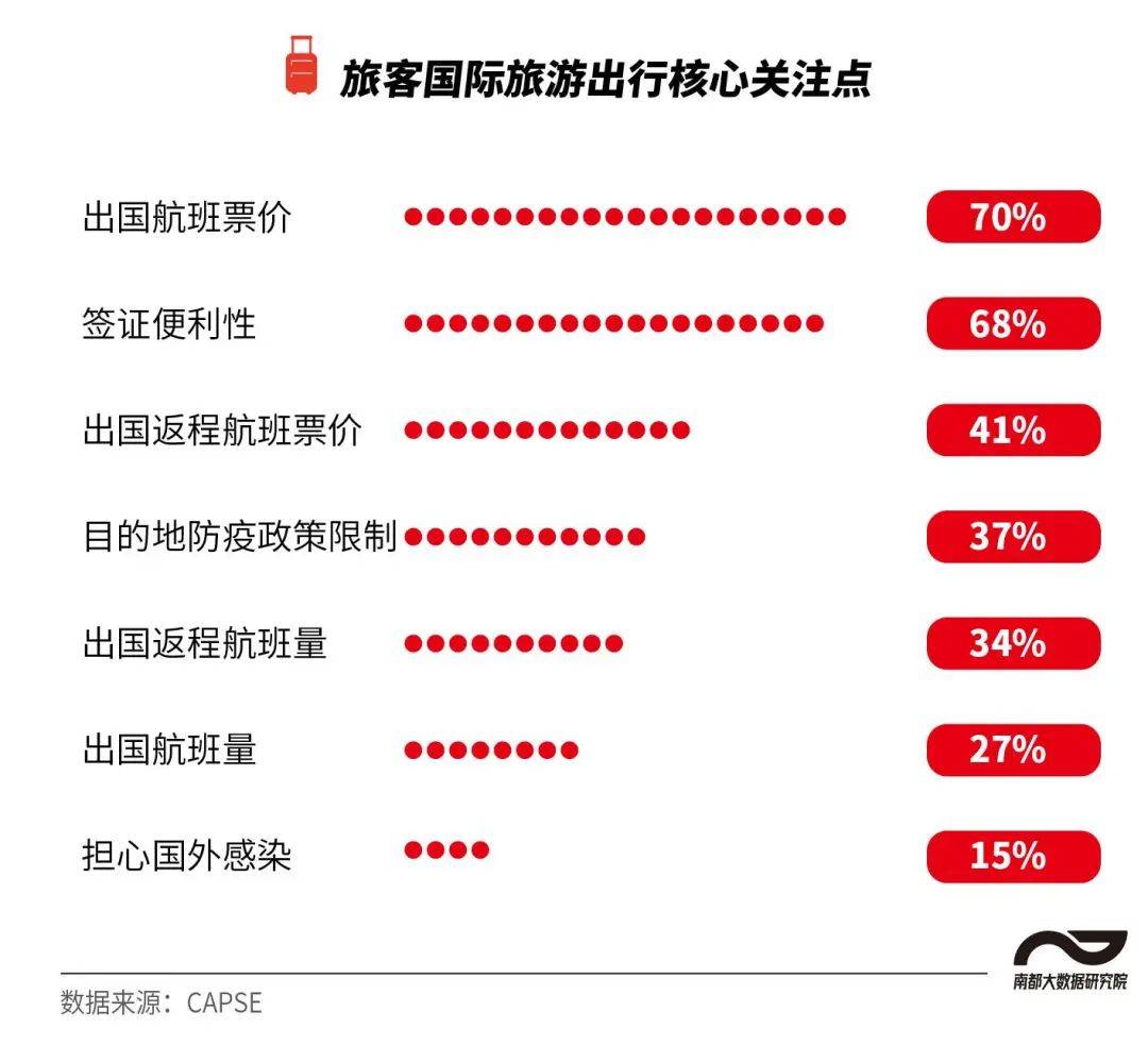 据民航数据服务平台CAPSE调查,出国航班票价和签证便利性是旅客国际出行的核心关注点,此外还有返程航班票价、当地的防疫政策等。