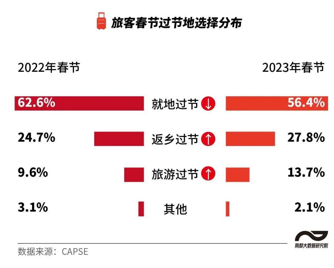 根据民航数据服务平台CAPSE数据,虽然选择就地过节的比例过半,但相比去年同期,受访者更倾向于返乡过节和旅游过节。