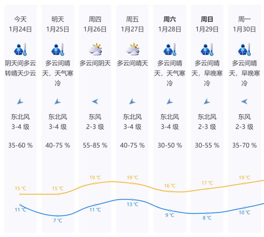 年初四(1月25日):早晨将出现7℃左右的过程最低气温,白天可见阳光,最大阵风6-7级。