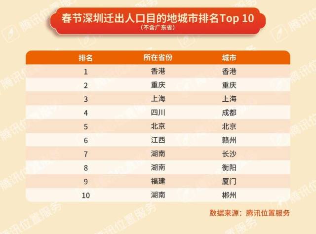 在广东城市以外,深圳的迁出人口更多是流向一二线城市,其中主要是流向香港、重庆、上海、成都、北京,赣州、长沙、衡阳、厦门、郴州则排名第六至第十位。