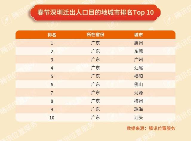 春节期间深圳人更爱去哪些城市?哪些城市的人更爱来深圳?记者1月30日从腾讯位置服务数据团队获悉,从人口迁出的目的地来看,深圳的迁出人口主要是流向广东省的其他城市,前十名全部是广东城市,其中流向惠州和东莞的人口遥遥领先其他城市,广州、汕尾、揭阳、佛山、河源位列其后。