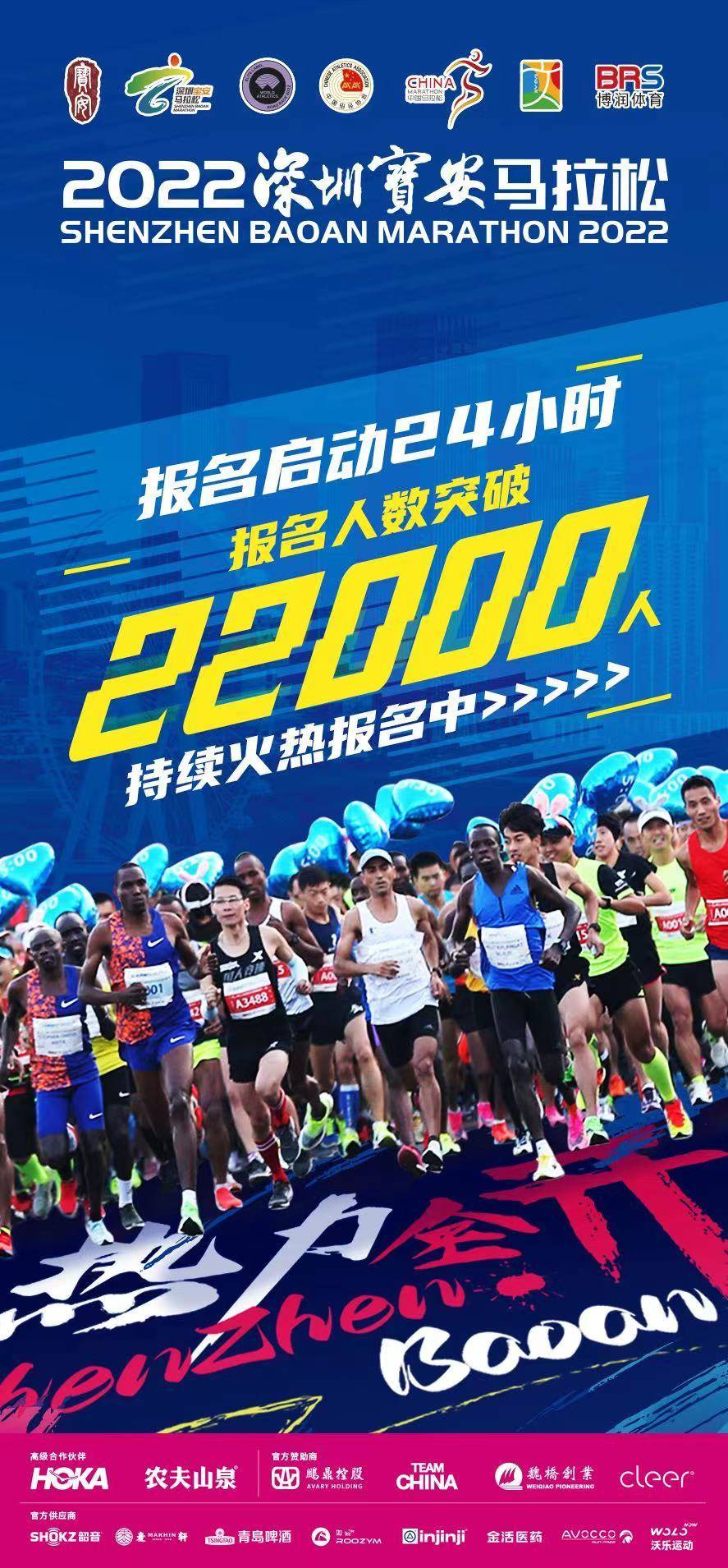 据2022深圳宝安马拉松组委会消息,本届“宝马“报名通道开启24小时内,报名总人数已突破22000人。组委会预计将在2月23日上午10时公布抽签结果。