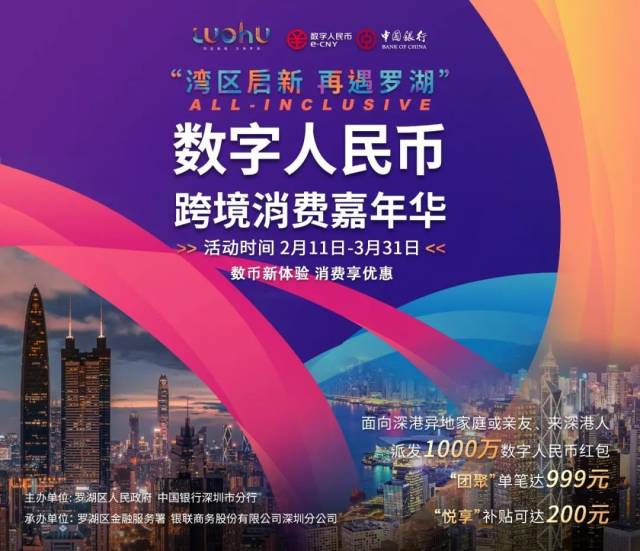 为促进深港融合,聚焦跨境消费,罗湖区特别举办数字人民币跨境消费嘉年华活动,依托数字人民币智能应用创新场景,面向深港异地家庭或亲友、来深港人两大群体,送出1000万元数字人民币红包,红包金额200元起,单笔最高达999元!