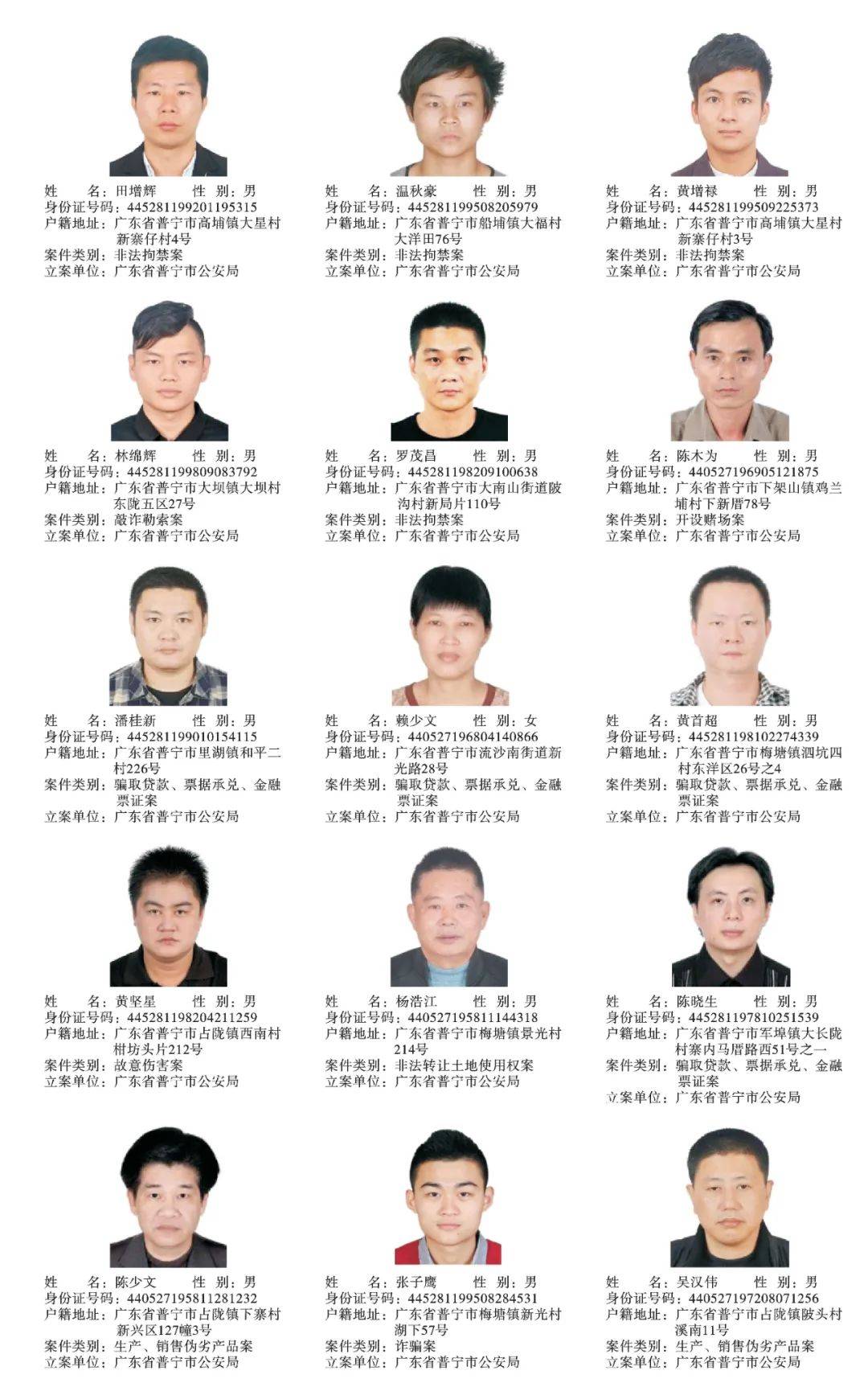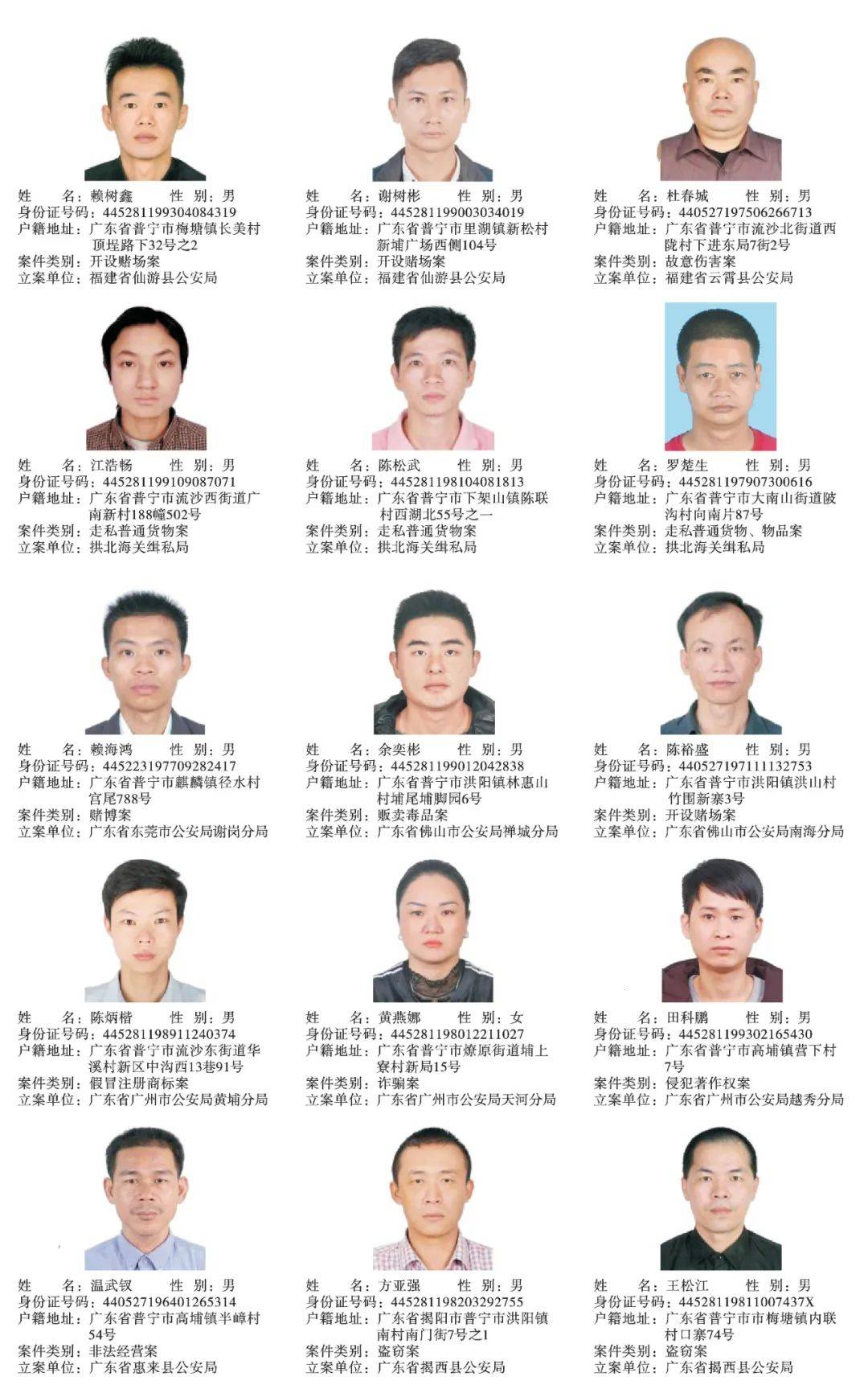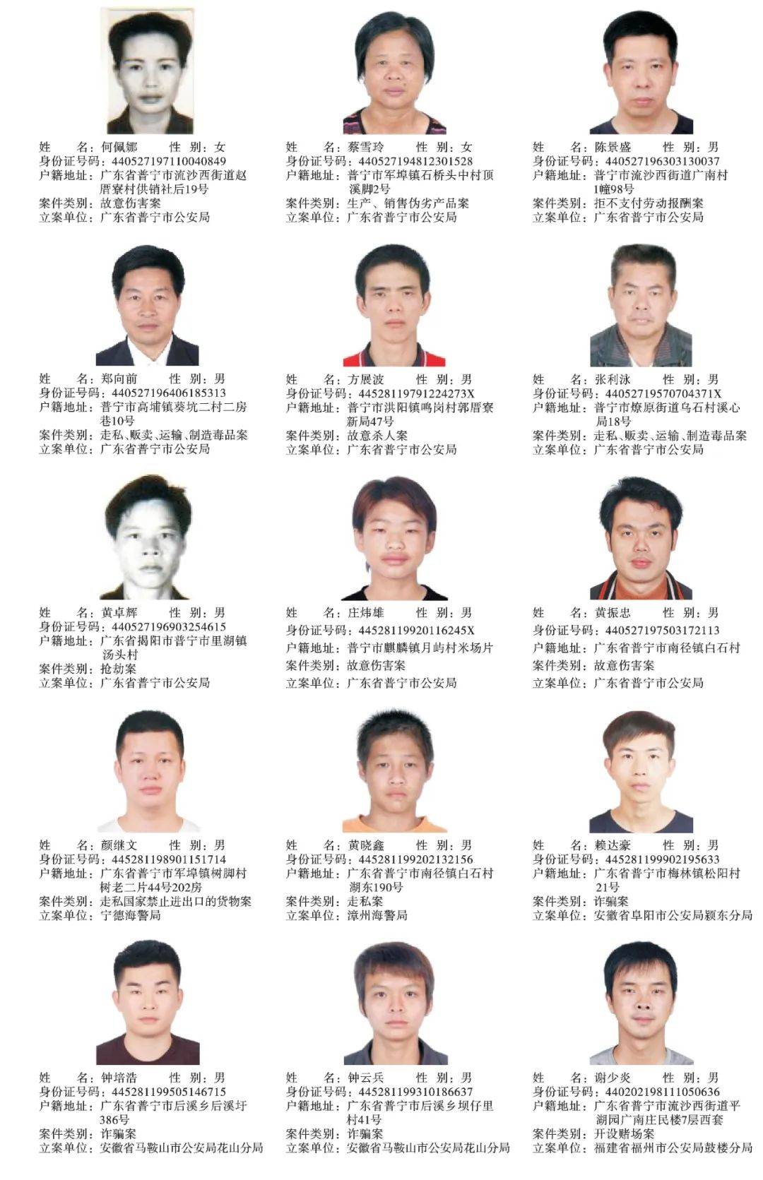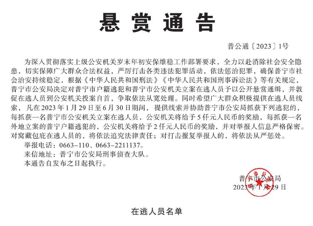 为深人贯彻落实上级公安机关岁末年初安保维稳工作部署要求,全力以赴消除社会安全隐患,切实保障广大群众合法权益,严厉打击各类违法犯罪活动,依法惩治犯罪,确保普宁市社会治安持续稳定。根据《中华人民共和国刑法》《中华人民共和国刑事诉讼法》等有关规定。普宁市公安局决定对普宁市户籍逃犯和普宁市公安机关立案在逃人员予以公开悬赏通缉,并敦促在逃人员到公安机关投案自首,争取依法从宽处理。同时希望广大群众积极提供在逃人员线索,凡在2023年1月29日至6月30日期间,提供线索并协助普宁市公安局抓获下列逃犯的,每抓获一名普宁市公安机关立案在逃人员,公安机关将给予5千元人民币的奖励,每抓获一名外地立案的普宁户籍逃犯的,公安机关将给予2千元人民币的奖励,并对举报人信息严格保密。对窝藏包庇在逃人员的,将依法追究法律责任;对打击报复举报人的,将依法从严惩处。