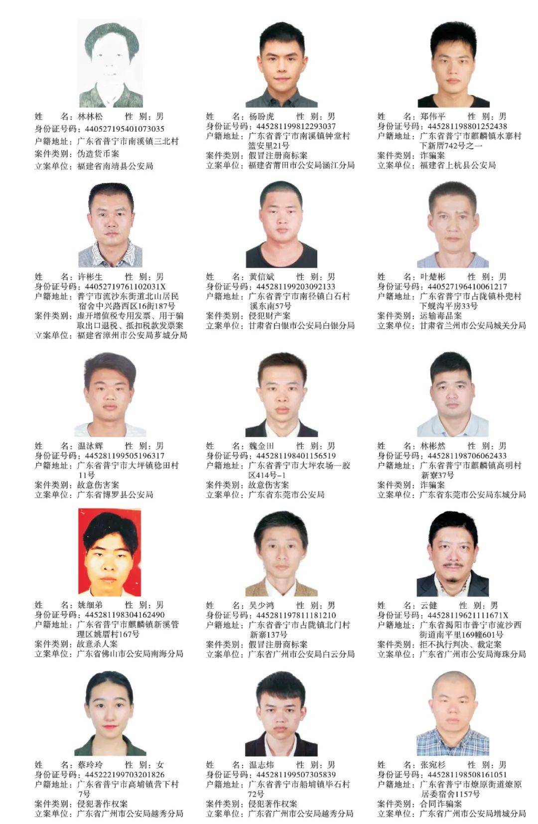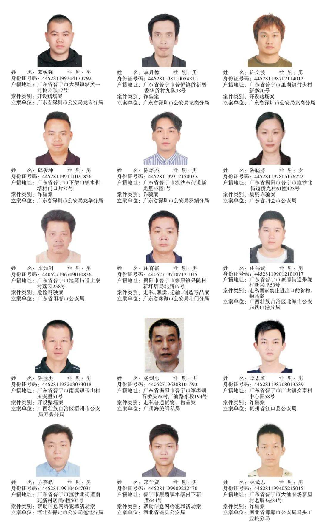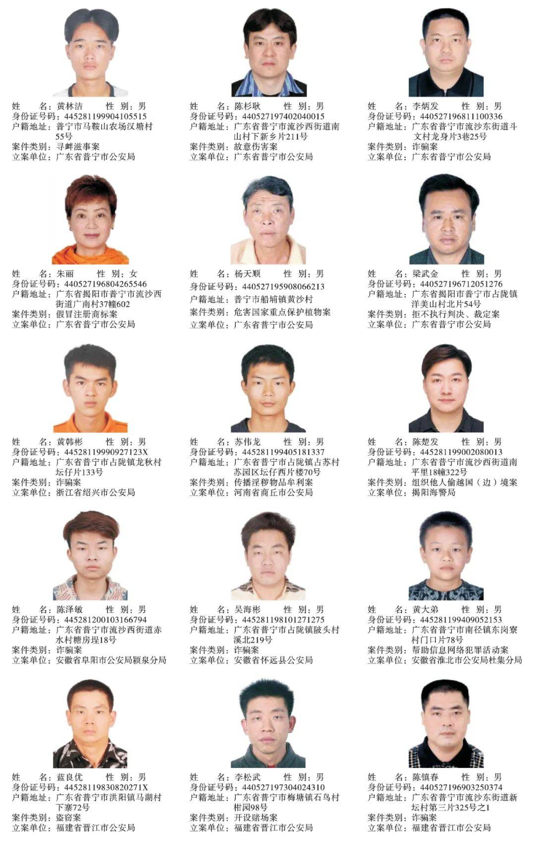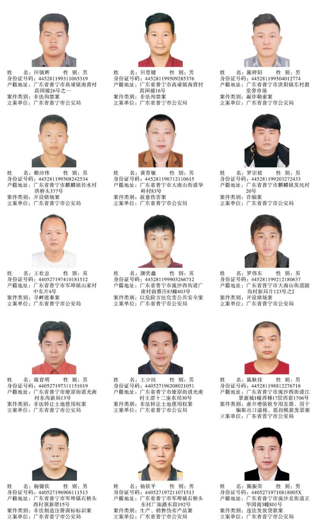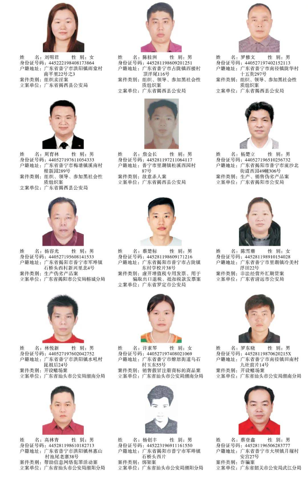 为深人贯彻落实上级公安机关岁末年初安保维稳工作部署要求,全力以赴消除社会安全隐患,切实保障广大群众合法权益,严厉打击各类违法犯罪活动,依法惩治犯罪,确保普宁市社会治安持续稳定。根据《中华人民共和国刑法》《中华人民共和国刑事诉讼法》等有关规定。普宁市公安局决定对普宁市户籍逃犯和普宁市公安机关立案在逃人员予以公开悬赏通缉,并敦促在逃人员到公安机关投案自首,争取依法从宽处理。同时希望广大群众积极提供在逃人员线索,凡在2023年1月29日至6月30日期间,提供线索并协助普宁市公安局抓获下列逃犯的,每抓获一名普宁市公安机关立案在逃人员,公安机关将给予5千元人民币的奖励,每抓获一名外地立案的普宁户籍逃犯的,公安机关将给予2千元人民币的奖励,并对举报人信息严格保密。对窝藏包庇在逃人员的,将依法追究法律责任;对打击报复举报人的,将依法从严惩处。