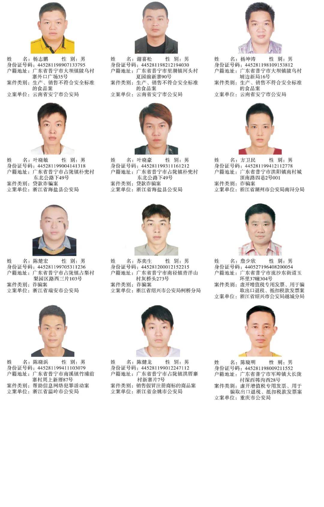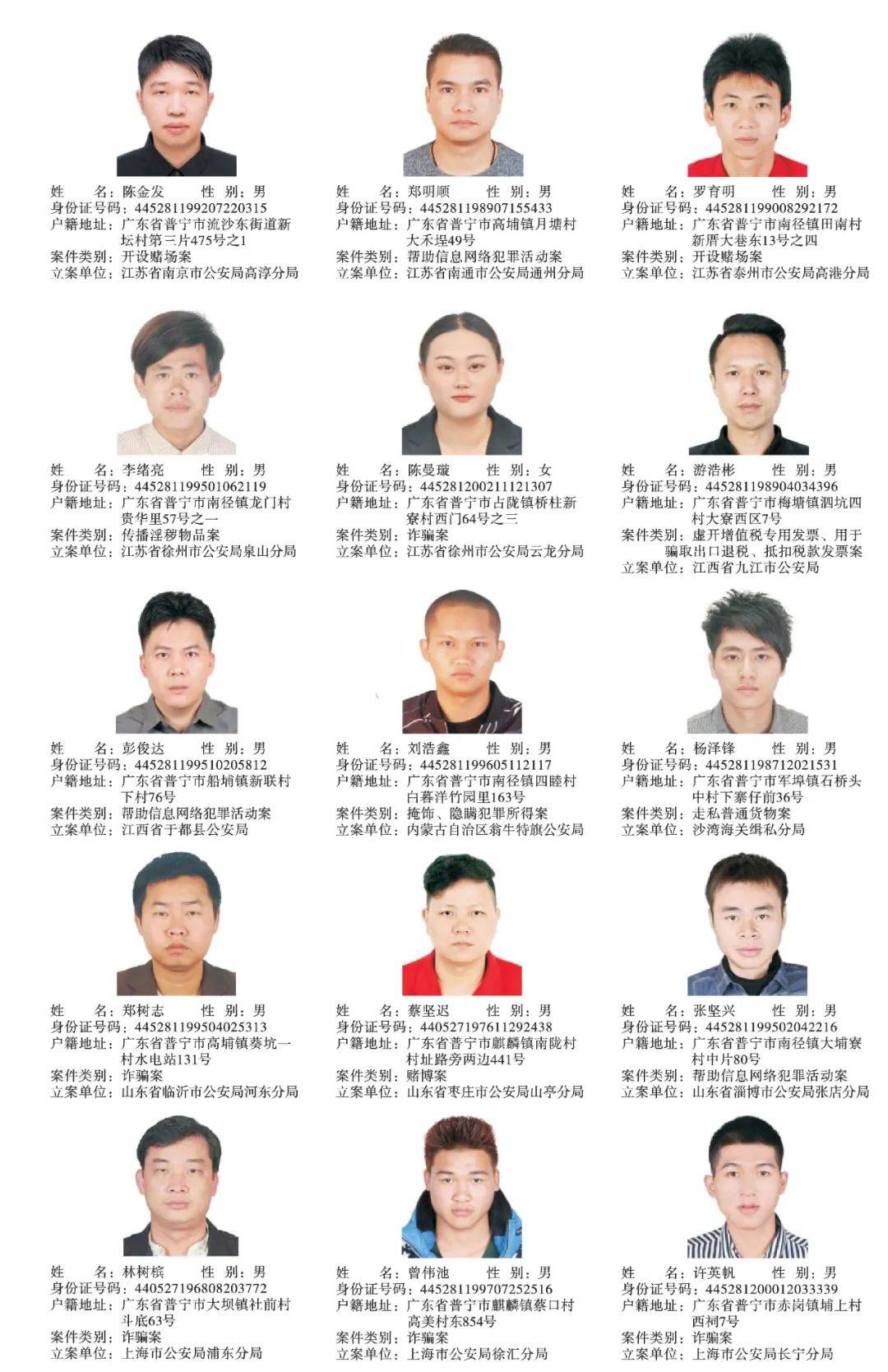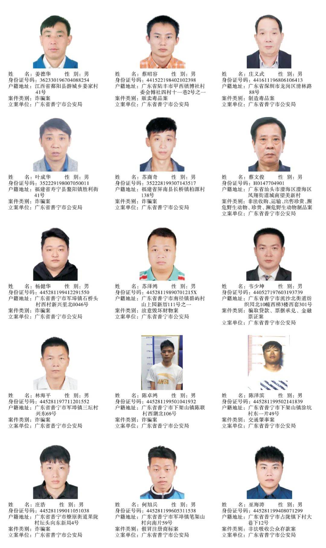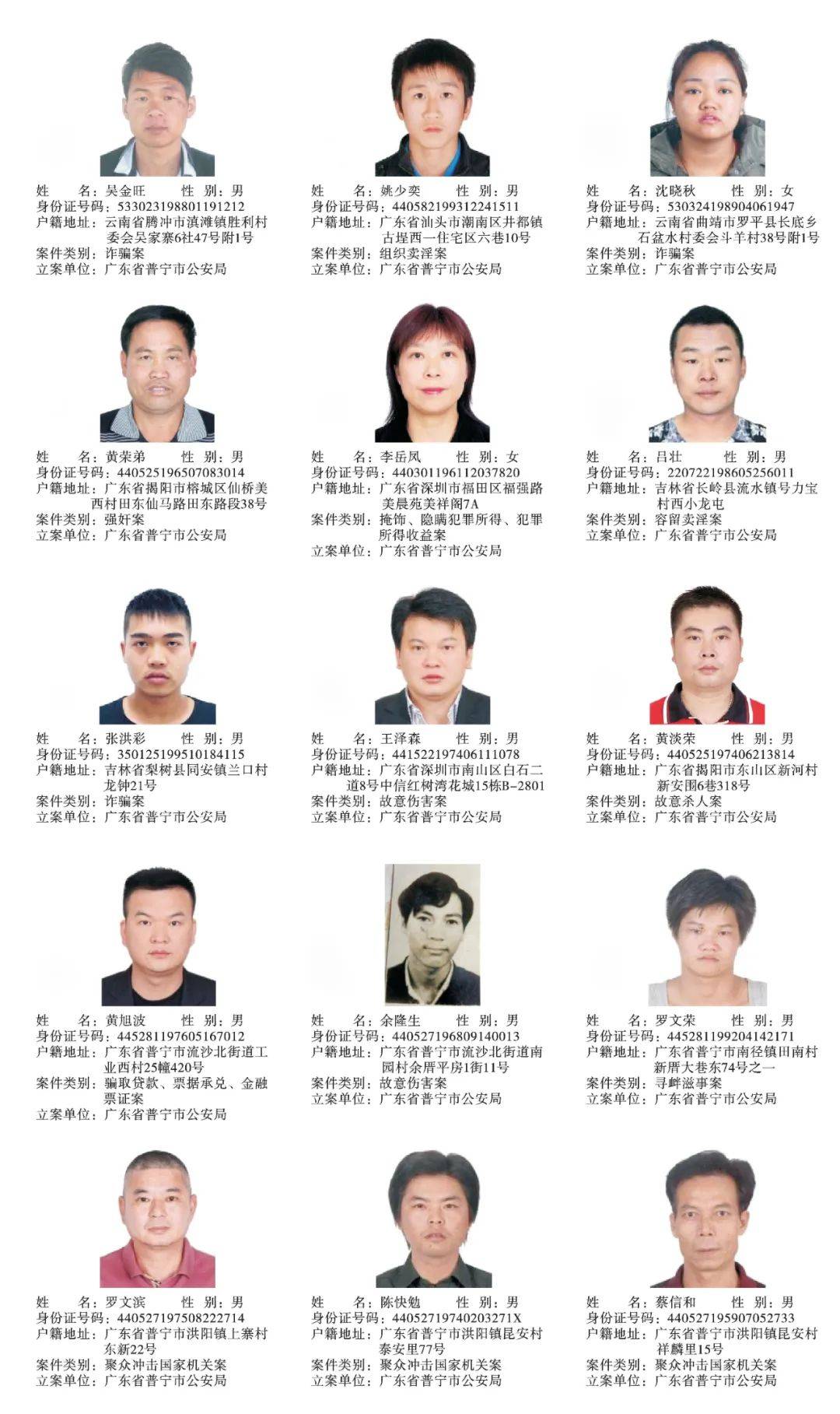 为深人贯彻落实上级公安机关岁末年初安保维稳工作部署要求,全力以赴消除社会安全隐患,切实保障广大群众合法权益,严厉打击各类违法犯罪活动,依法惩治犯罪,确保普宁市社会治安持续稳定。根据《中华人民共和国刑法》《中华人民共和国刑事诉讼法》等有关规定。普宁市公安局决定对普宁市户籍逃犯和普宁市公安机关立案在逃人员予以公开悬赏通缉,并敦促在逃人员到公安机关投案自首,争取依法从宽处理。同时希望广大群众积极提供在逃人员线索,凡在2023年1月29日至6月30日期间,提供线索并协助普宁市公安局抓获下列逃犯的,每抓获一名普宁市公安机关立案在逃人员,公安机关将给予5千元人民币的奖励,每抓获一名外地立案的普宁户籍逃犯的,公安机关将给予2千元人民币的奖励,并对举报人信息严格保密。对窝藏包庇在逃人员的,将依法追究法律责任;对打击报复举报人的,将依法从严惩处。