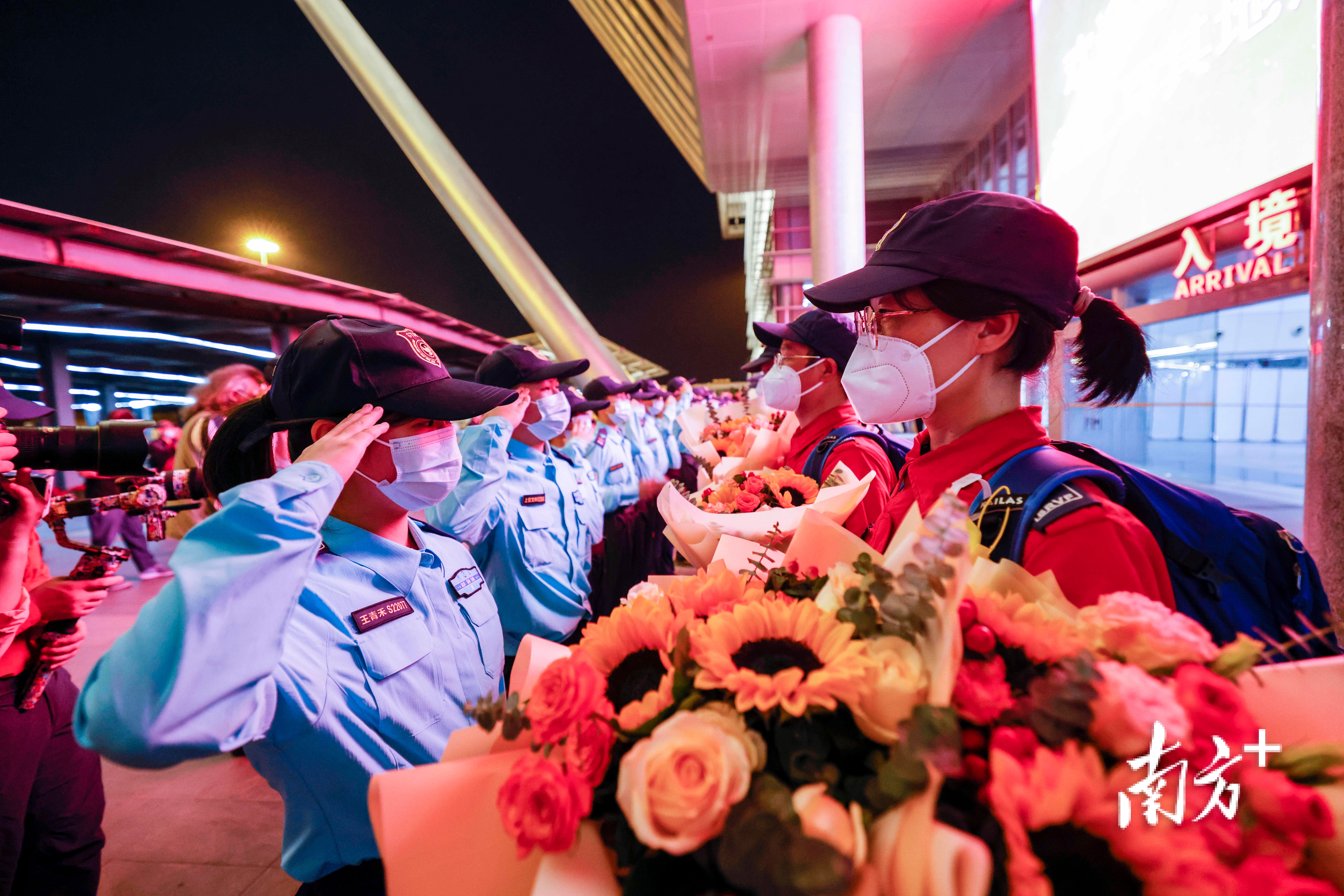 当晚,深圳市公益救援队伴随着鲜花和掌声落地深圳湾口岸,经历了数日不眠不休的奋战,勇士们终于平安归来并受到了热烈欢迎。