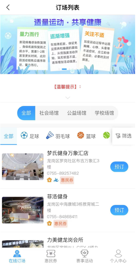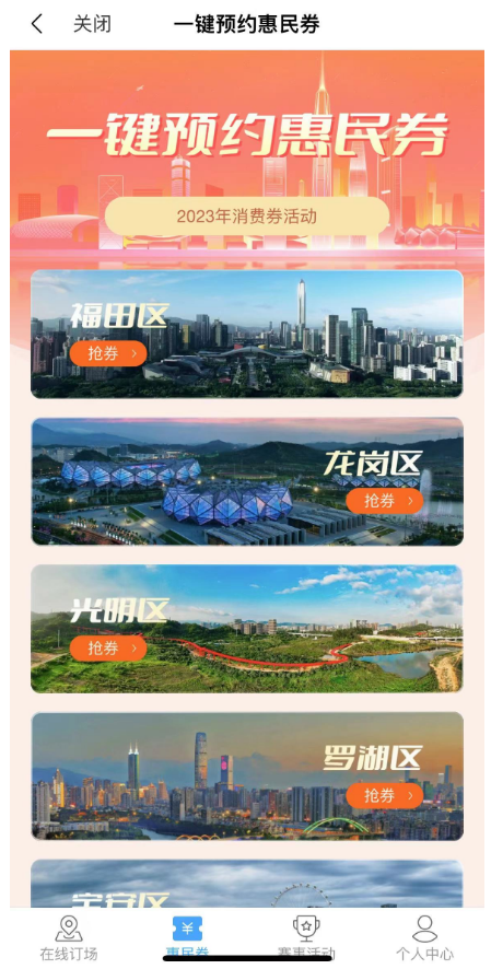 i深圳体育场馆“一键预约”平台自上线以来,总体运营效果良好,深受广大市民朋友欢迎,2023年,计划发放6000万元体育优惠券,其中市级4000万元。春节期间,已发放了750万元。在预约平台,每月、每周都可以领取优惠券,欢迎广大市民踊跃抢券。详情>>