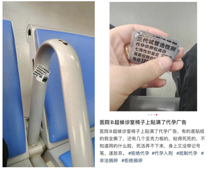 3月6日,有网友在社交平台发帖称,深圳市第二人民医院的B超候诊室椅子上贴满了代孕广告,该网友表示自己将贴纸类广告都撕掉了,但有的广告粘得牢固导致撕不下来。