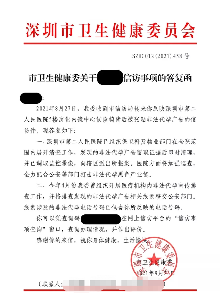 事实上,奥一新闻记者检索发现,早在2021年9月,深圳市卫生健康委员会曾就市民反映深圳市第二人民医院5楼消化楼内镜中心候诊椅背后被张贴非法代孕广告进行过回函,答复中提到,深圳市第二人民医院已组织保卫科及物业部门在全院范围内展开清查工作,发现的非法代孕广告留取证据后即时清理,并已调取监控录像,向辖区派出所报案。医院方面将加强巡查,全力配合公安等部门打击非法代孕黑色产业链。