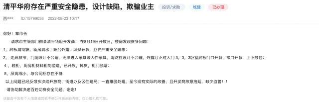 在人民网上的业主留言也表示:走廊狭窄,门洞设计不合理,无法进入家具等大件家具;消防栓设计不合理,外露且正对大门 ;并质疑品质差:卧室门口地板开裂,接口开裂,上下鼓包; 鞋柜,厨房柜材料粗制滥造,已开裂,掉皮,柜门脱落等,并指出以上问题已经反馈多次。