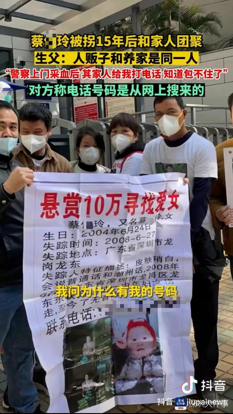 15年前,年仅4岁的潮汕女孩蔡某玲在深圳龙岗某商场被一名中年妇女带走,之后,蔡某玲家人一直苦苦寻找其下落整整15年。其间,其家人走遍全国各地,并悬赏10万元,但仍杳无音信。3月22日,南都记者从深圳警方获悉,蔡某玲已在四川被找到,并于3月20日在深圳和家人团聚。