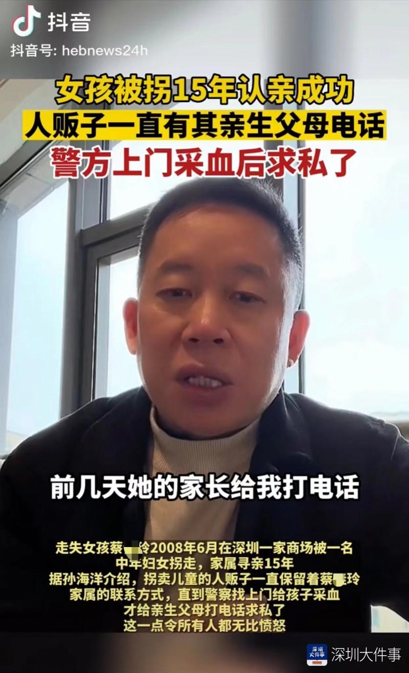 但孙海洋在视频中指出,拐卖儿童的人贩子一直保留着蔡某玲家属的联系方式,直到警察找上门给孩子采血,才给亲生父母打电话求私了,“这一点令所有人都无比愤怒。”