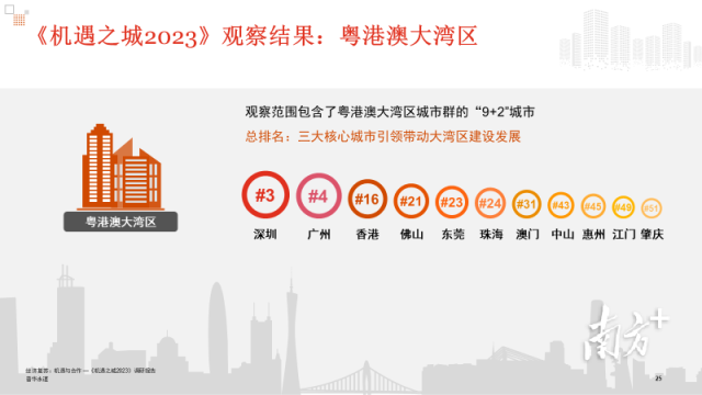粤港澳大湾区“9+2”城市的排位分别为:深圳(3)、广州(4)、香港(16)、佛山(21)、东莞(23)、珠海(24)、澳门(31)、中山(43)、惠州(45)、江门(49)、肇庆(51)。