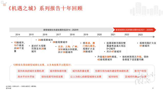 今年是《机遇之城》第十年发布。自2014年首发的十年来,《机遇之城》持续全方位观察中国城市在经济社会发展和城镇化进程。报告指出,当前中国已迈入高质量发展阶段,区域协调、数字经济、可持续发展等将是下一个十年的中国城市的重要议题。