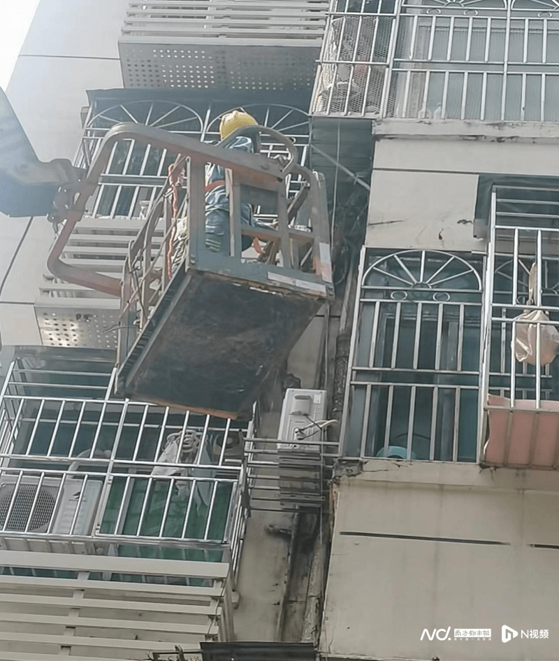 施工队到达现场后,先对小区树木进行排查。施工队首先查看树木的长势,接着架上梯子,提着电锯,爬上顶楼吊绳。由于老旧小区硬件设施较破旧,工作人员们摸索着站在树上面,凭着多年的工作经验,在不影响墙体和居民正常生活的情况下,将存在安全隐患的树枝进行修剪和根除。为了防止树根再次长成毁坏墙体的大树,施工队用配好的药水对墙体里面的根部进行消杀。