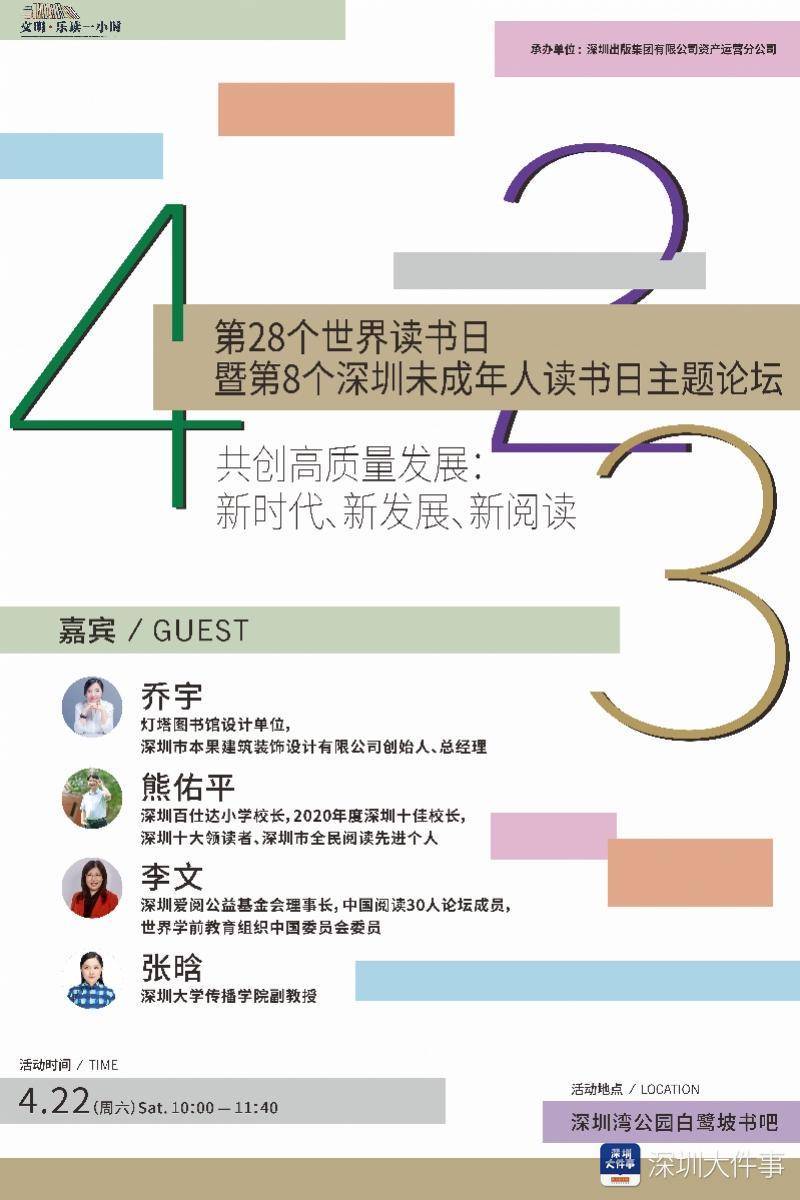 “共创高质量发展:新时代、新发展、新阅读”主题论坛将于4月22日在深圳湾公园白鹭坡书吧举行,为长期关注并深耕全民阅读事业不同领域的专家学者以及阅读爱好者搭建文化交流的平台。活动突出全域全民共同参与,将邀请深圳市本果建筑装饰设计有限公司创始人乔宇,深圳百仕达小学校长熊佑平,深圳爱阅公益基金会理事长李文,深圳大学传播学院副教授张晗等嘉宾围绕主题对谈交流,从公园书吧、书香校园、儿童阅读、数字阅读等角度出发,分享各自在全民阅读推广中的实践与创新,为深圳全民阅读推广注入更多知识动能。