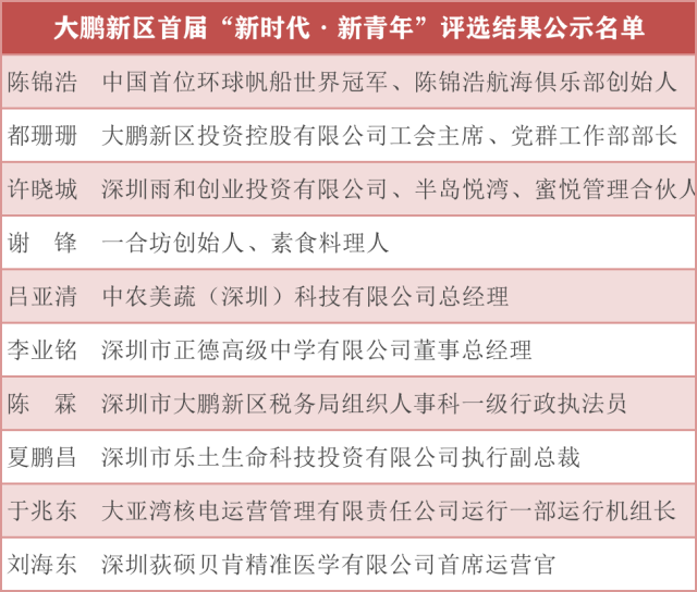 为大力弘扬五四精神,宣传展示大鹏新区在各行各业涌现出的新时代大鹏新青年和先进事迹,引领广大青年在推进新区高质量发展新征程中担当作为,以青春力量支持大鹏新区打造“绿水青山就是金山银山”实践创新标杆,大鹏新区群团工作部联合大鹏新区团工委开展首届“新时代·新青年”活动,现将评选结果予以公示(排名不分先后)。