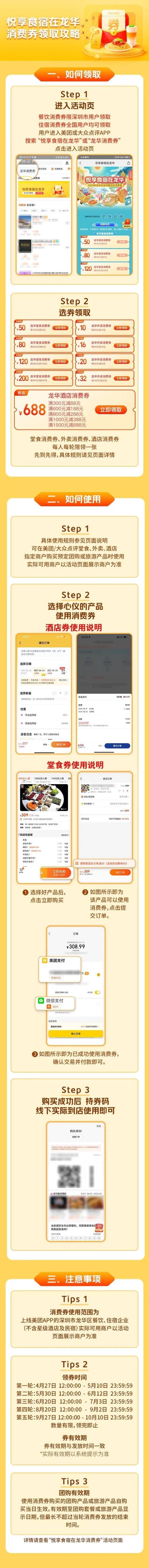 登录美团或大众点评APP,首页搜索“悦享食宿在龙华”或“龙华消费券”,进入活动页面即可抢券。活动期间内将分多轮次发放消费券,每轮活动每个用户最多领取一张外卖券、一张堂食券以及一张酒店阶梯满减券。消费券先到先得,领完为止,政府消费券与美团平台优惠券可叠加使用。消费券可以在美团App、大众点评App中使用,消费券使用范围为上线美团APP的深圳市龙华区餐饮、住宿企业(不含星级酒店及民宿)。