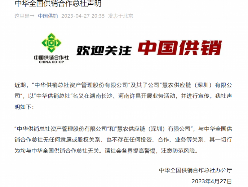 据中华全国供销合作总社官方微信公众号的公告, “中华供销总社资产管理股份有限公司”及其子公司“慧农供应链(深圳)有限公司”,以“中华供销总社”名义在湖南长沙、河南许昌开展业务活动,并进行宣传。公告表示,“中华供销总社资产管理股份有限公司”和“慧农供应链(深圳)有限公司”,与中华全国供销合作总社无任何隶属或股权关系,也不存在任何投资、合作、业务等关系,其一切行为均与中华全国供销合作总社无关。请社会各界提高警惕,注意防范风险。