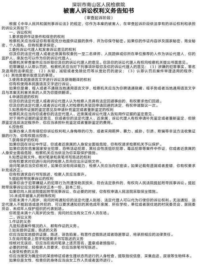 深圳市南山区人民检察院表示,因案件被害人人数众多,根据《中华人民共和国刑事诉讼法》的有关规定,经该院联系,仍有部分被害人无法送达,现采取公告方式告知本案被害人的诉讼权利义务,详见《深圳市南山区检察院被害人诉讼权利义务告知书》。联系人:张助理;联系电话:0755-86212782。